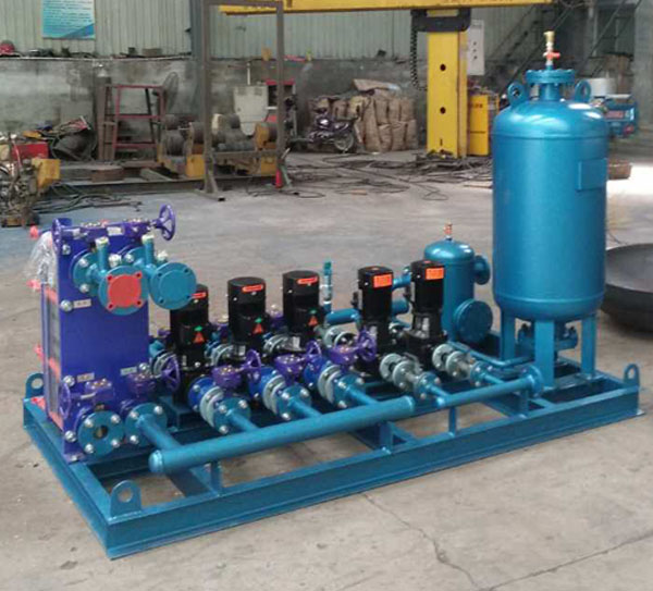 1、由于把板式换热器二次网的循环水泵,补水箱和除污器等合理的组合成一个整体,结构紧凑,占地面积小,容易操作和观察。