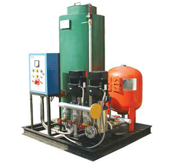 该产品是利用罐内气体的可缩性,来调节水量,其作用等同于高位水箱、水塔。根据波尔定律,利用气体状态方程的原理自动调节罐体、胶囊内外的体积量,从而调节压力的。它是由稳压器、膨胀器、补水泵和电控制柜四部分组成。其中,稳压器可以有效缓解水泵启停时造成的水锈及噪音。根据系统压力变化,通过稳压器内气体和胶囊的伸缩可以给系统补水达到稳定系统压力的目的。膨胀器具有吸纳系统超压而溢流出来的水,同时可以作补水箱使用,而特别重要的是膨胀器还具有液位控制功能具有低水位保护作用。补水泵采用耐磨进口机械密封,噪音低,电耗少,效率高。其主要功能是给整个系统进行补水达到稳定系统压力的目的。电控制柜采用智能化控制,实现全自动运行,无需专人看管,控制灵活,其主要功能就是依据设定的压力根据系统压力的变化来控制水泵的启停,并且可以控制双泵交替或同时运行。
